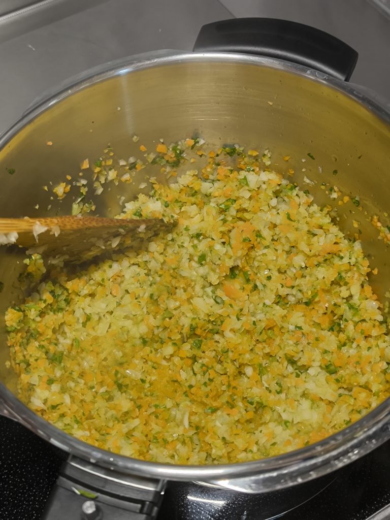 まずはタマネギ1個、セロリ1本、ニンジン1本をみじん切りして、オリーブオイルでひたすら炒め「ソフリット」を作ります。調味料に頼らずとも、トマト系パスタのうま味を大きく引き上げてくれます。