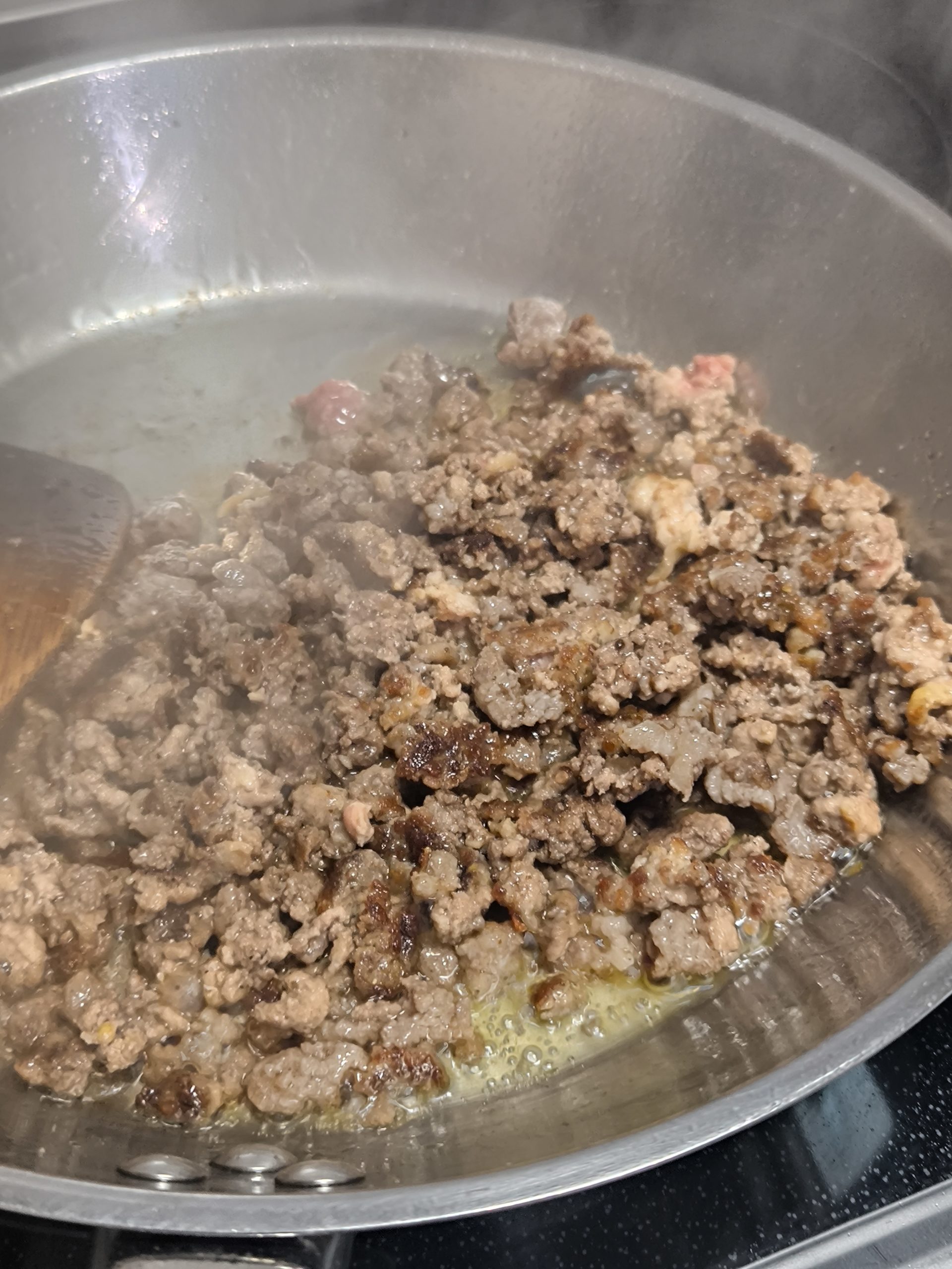 あらびきの牛ミンチに焦げ目をつけるように炒め、フライパンについた焦げ目を赤ワインで浮かせてこそげ落としながらソフリットと合わせてトマト缶を投入。