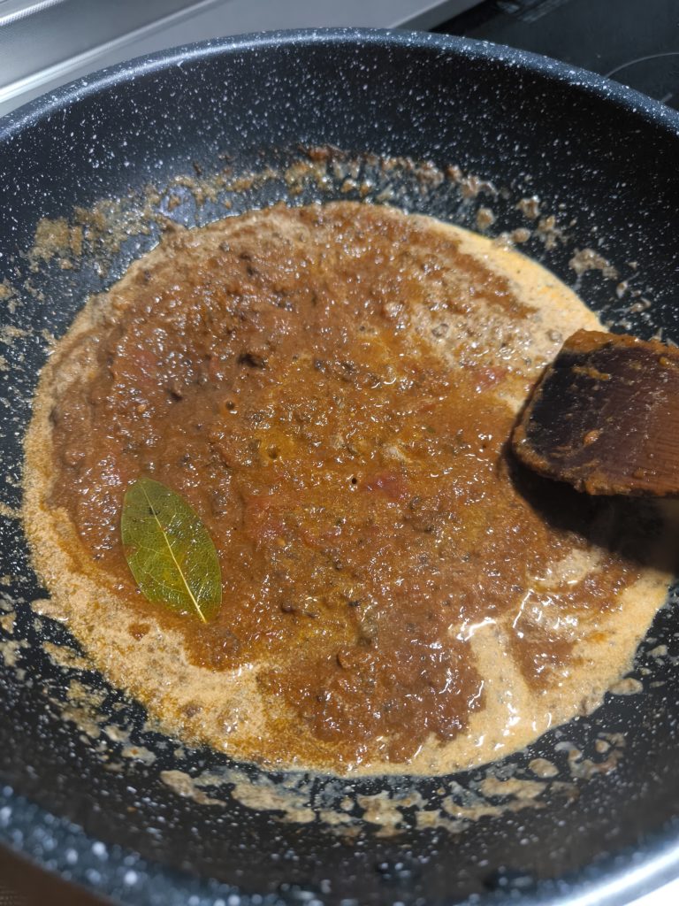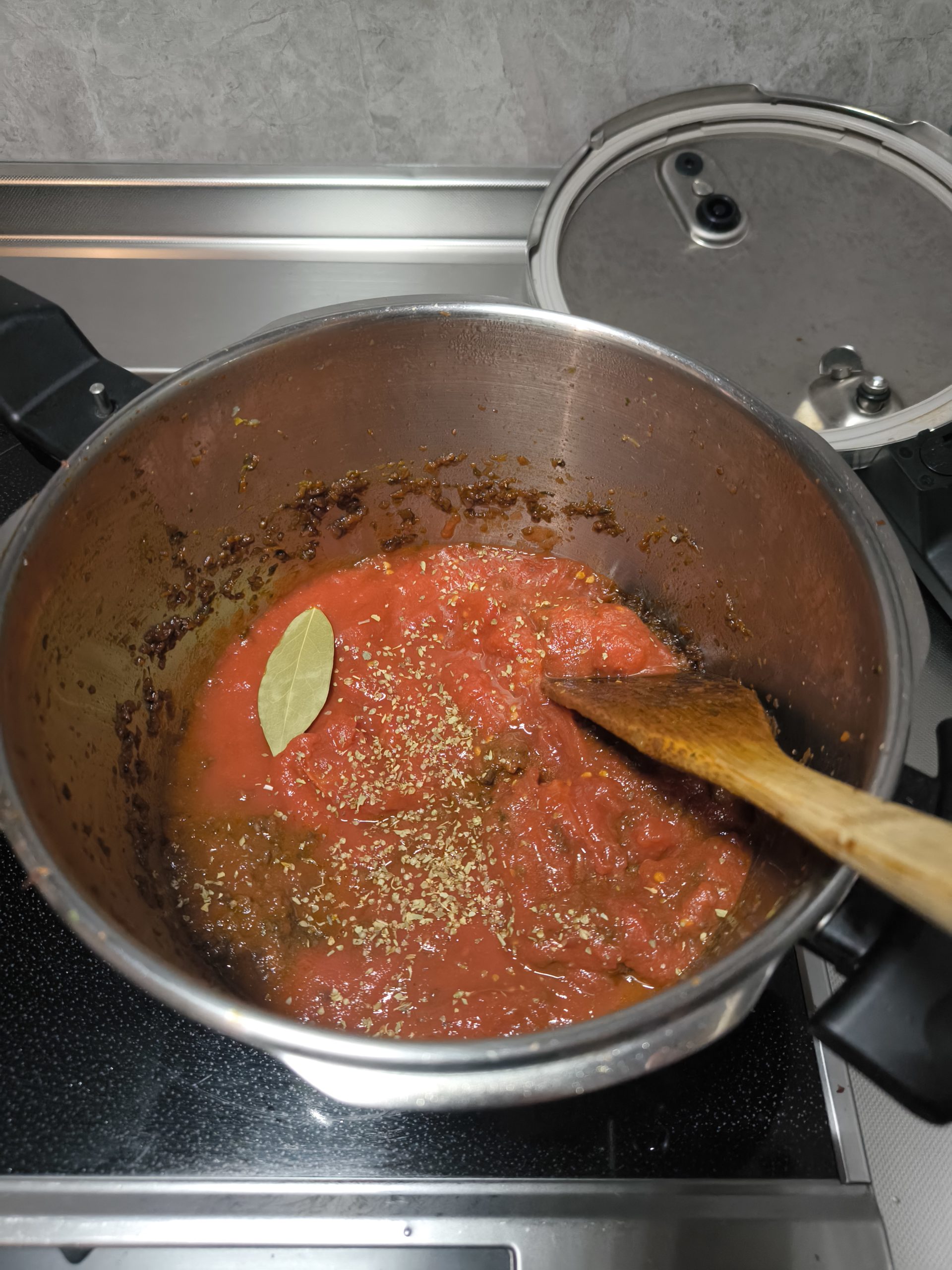 ローリエ、オレガノなどハーブを入れて数十分煮込みます。
