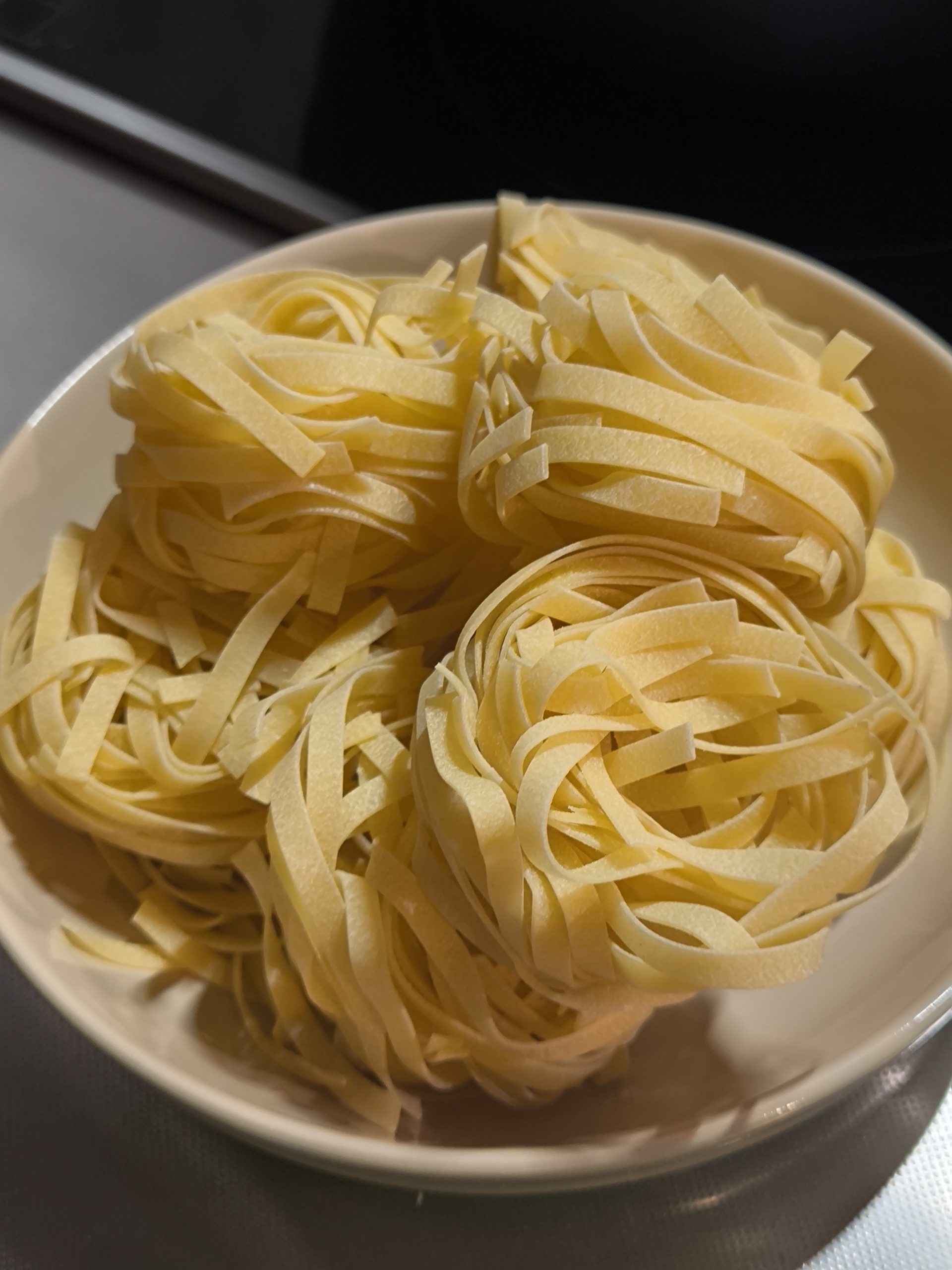 使うパスタは濃厚なソースによく合うタリアテッレやフェットチーネ、リングイネが好み。早ゆでの日本製でなく、イタリア産のものが良いです。個人的にはDE CECCOのリングイネが万能で使いやすいので、見つけたらいつも買ってます。今回はもっと平たいのが欲しかったのでPRAIのタリアテッレを使用。