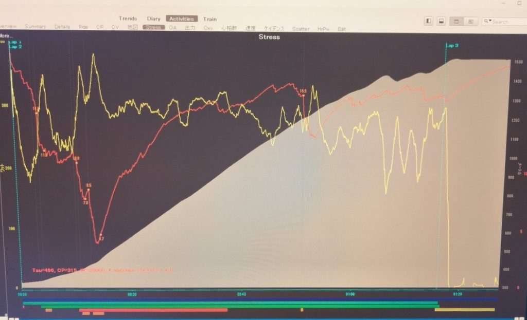 ゴール手前200mぐらいで、途中で引き離したはずの方に追い抜かれ、意気消沈。スプリントも出来ずFTP未満で計測ラインを走り抜けました。タイムは過去最低の1時間16分30秒。