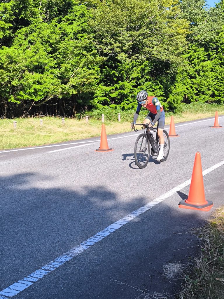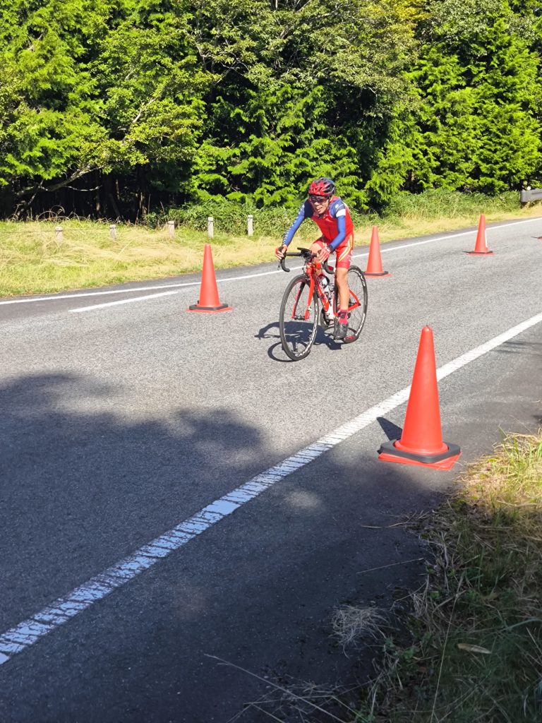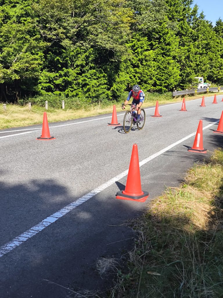 激坂区間終盤1kmほどで、今大会の大本命である選手(後の総合優勝者)に抜かれます。脚はある程度回復してきているので、着かせてもらいます。下りで加速、その勢いでの登り返しも、ドラフティングの恩恵に与りました。