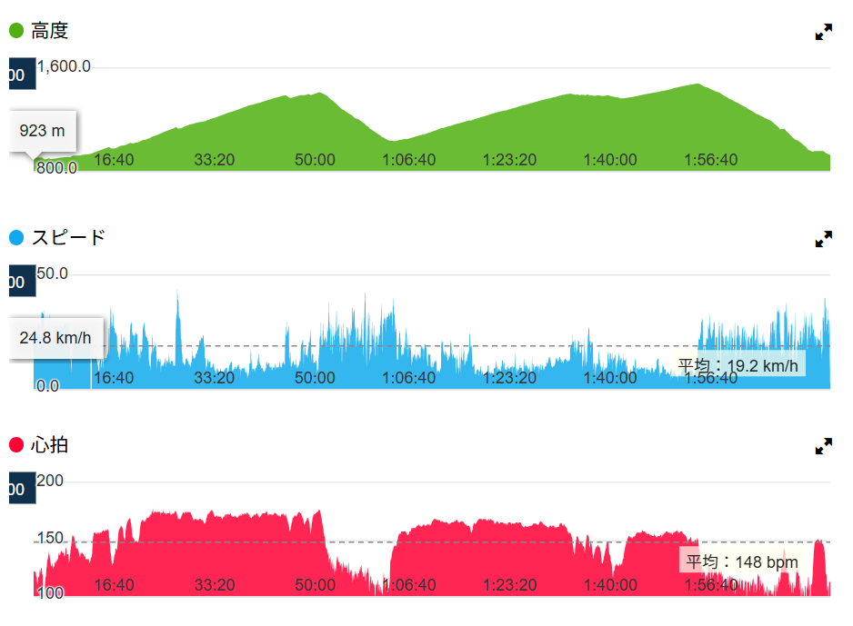 ところどころ現れる下りでは前2人と明らかに差が開き度胸と技術の差を痛感。ごく短い下りで10~30m離され、登りでなんとか追いつくことは出来ましたが追いつく度に体力を消耗します。最初の登り切り(約7km/400mUP)は、MTB3人で通過。ここでも心拍数は90%前後ながら着いていくことは可能なぐらいのペースでした。