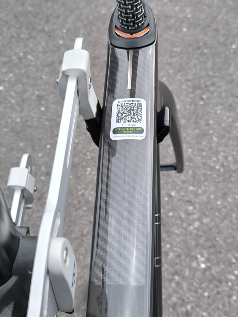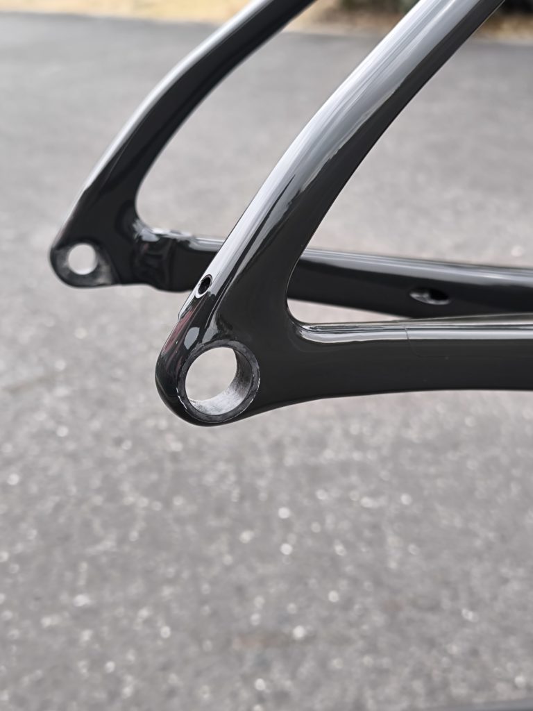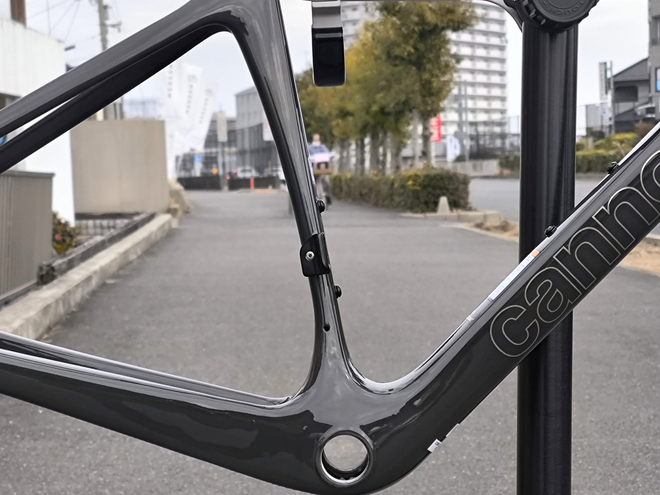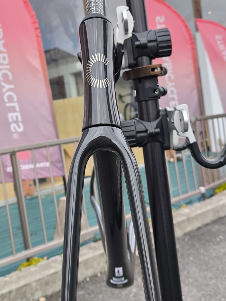 トップチューブは扁平しており、横から見るとかなり薄いです。振動吸収に貢献し、ダンシングの際の振りの軽さにも繋がりそうです。
