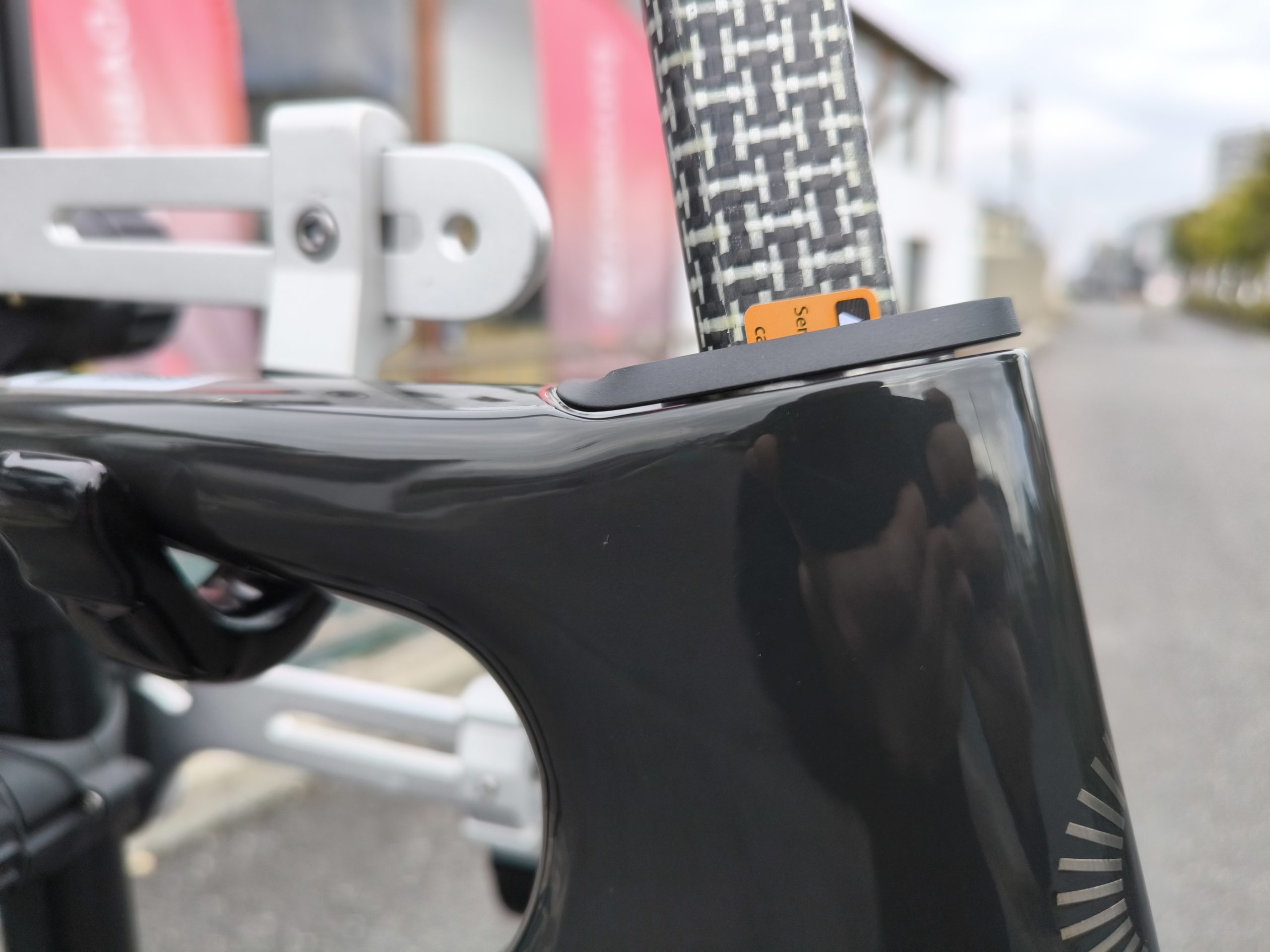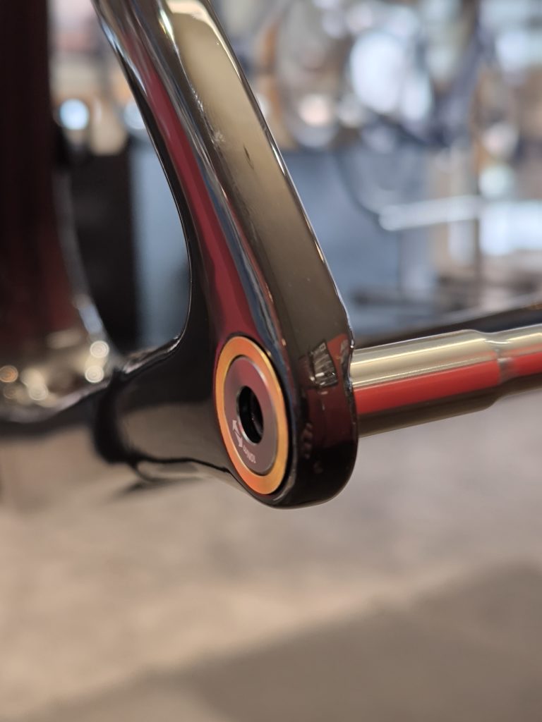 シートポストのグロメットもヘッドチューブ同様にフレームと一体化。汗や雨などの侵入を防ぎつつ、空力的な損失をゼロにする素晴らしい改良です。