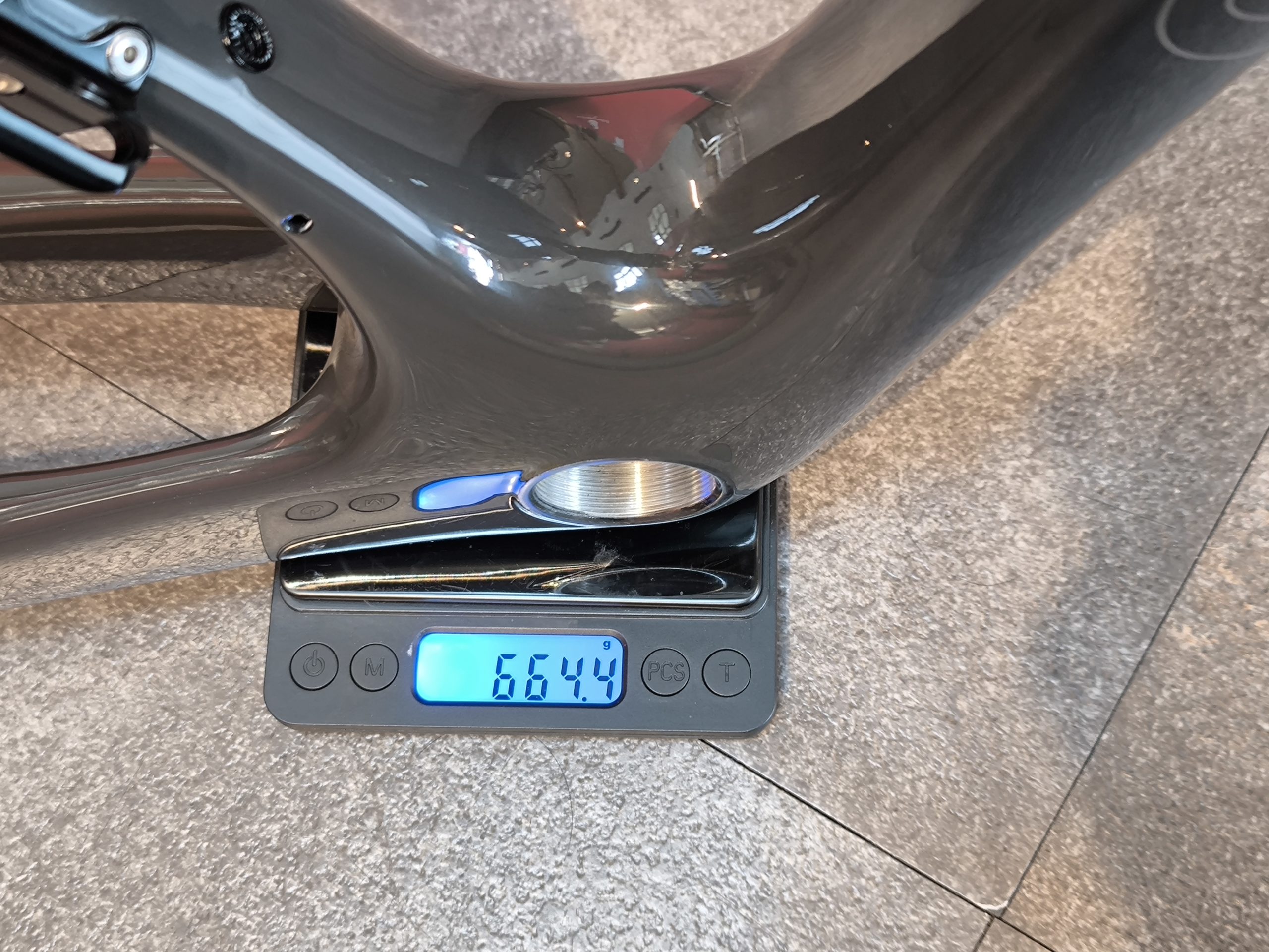 ・・・なのですが、参考までに入荷した50サイズ・RAWカラーのフレーム単体重量(Keeperコーティング済)を測ってみると・・・まさかの「664g」という驚愕の数値でした。