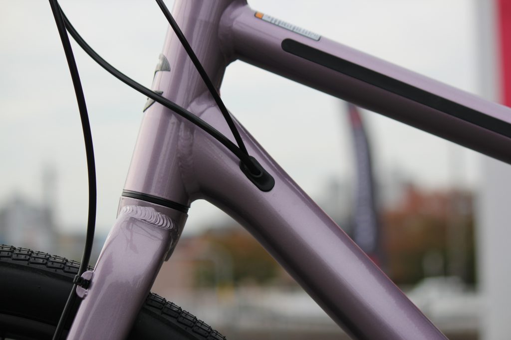 メタリックな質感で高級感を演出しています。トップチューブに内蔵されたバンパーは、街中などでバイクを立てかける際に大変便利ですよ。