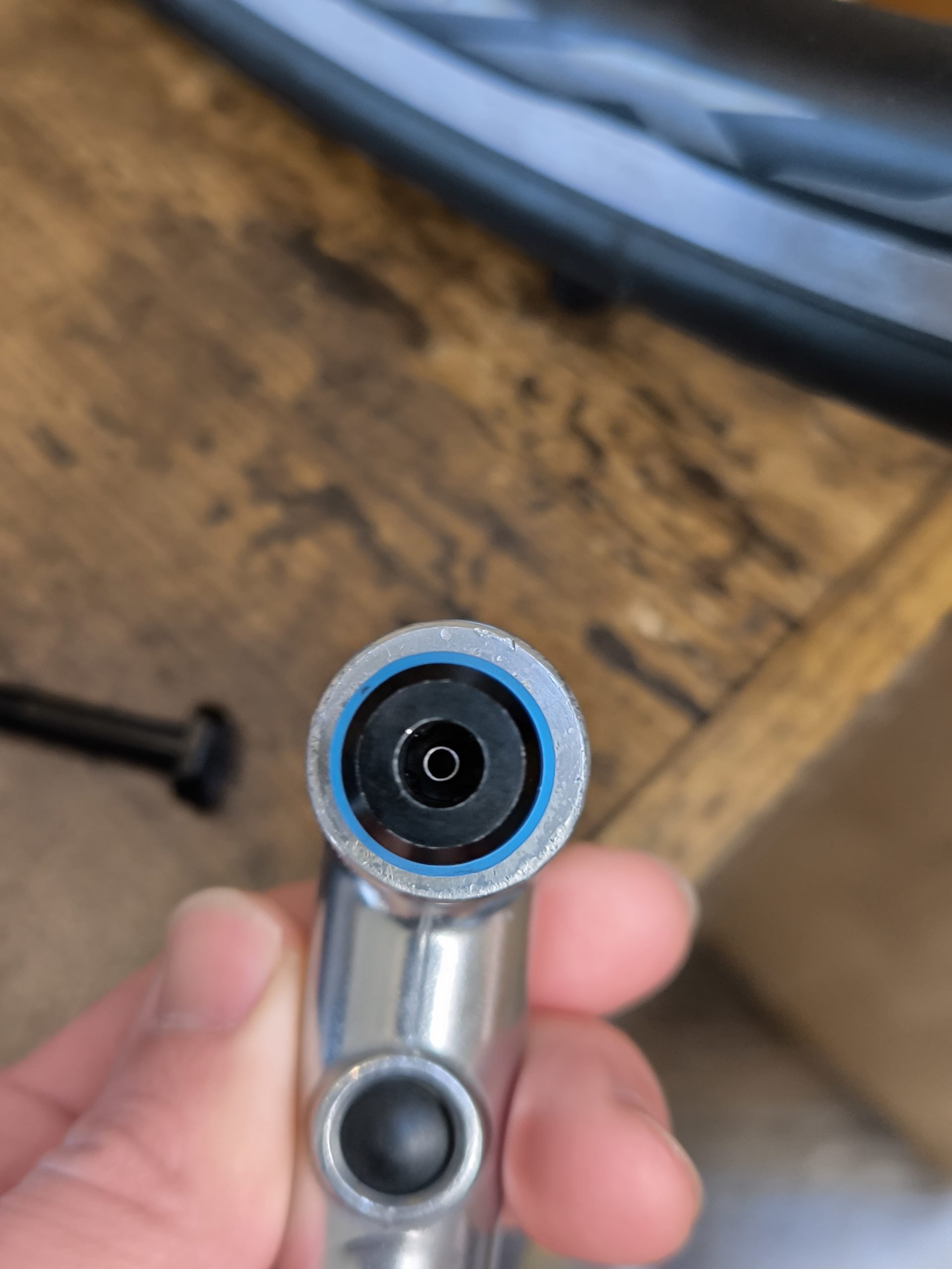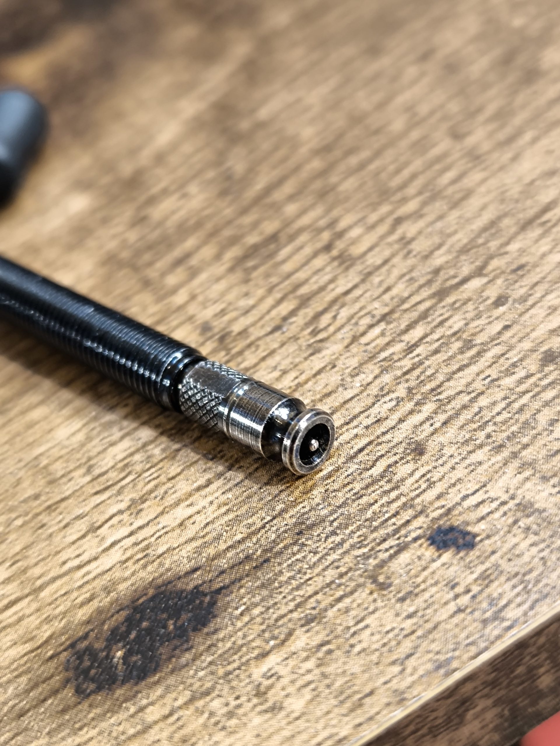 専用ポンプヘッドをバルブに押し込むだけでカチッと固定され、抜くときも引っ張るだけで外れます。解放時に手を挟むことのある硬いロックレバーもなければ、仏式バルブのように先端のネジを緩める・締める手間もありません。